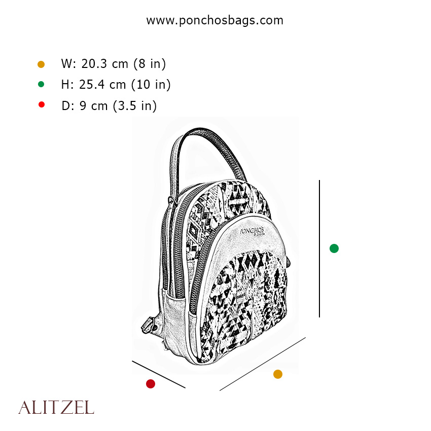 The Alitzel backpack seamlessly blends authentic Guatemalan textile tradition with premium leather craftsmanship, creating a unique, elegant, and functional piece for everyday wear. This handcrafted backpack features a stunning front panel made from traditional Mayan woven fabric with vibrant multicolor geometric patterns, meticulously crafted by local Guatemalan artisans using centuries-old backstrap loom techniques. Each Alitzel backpack is a one-of-a-kind piece that celebrates Mayan heritage and artisan identity.