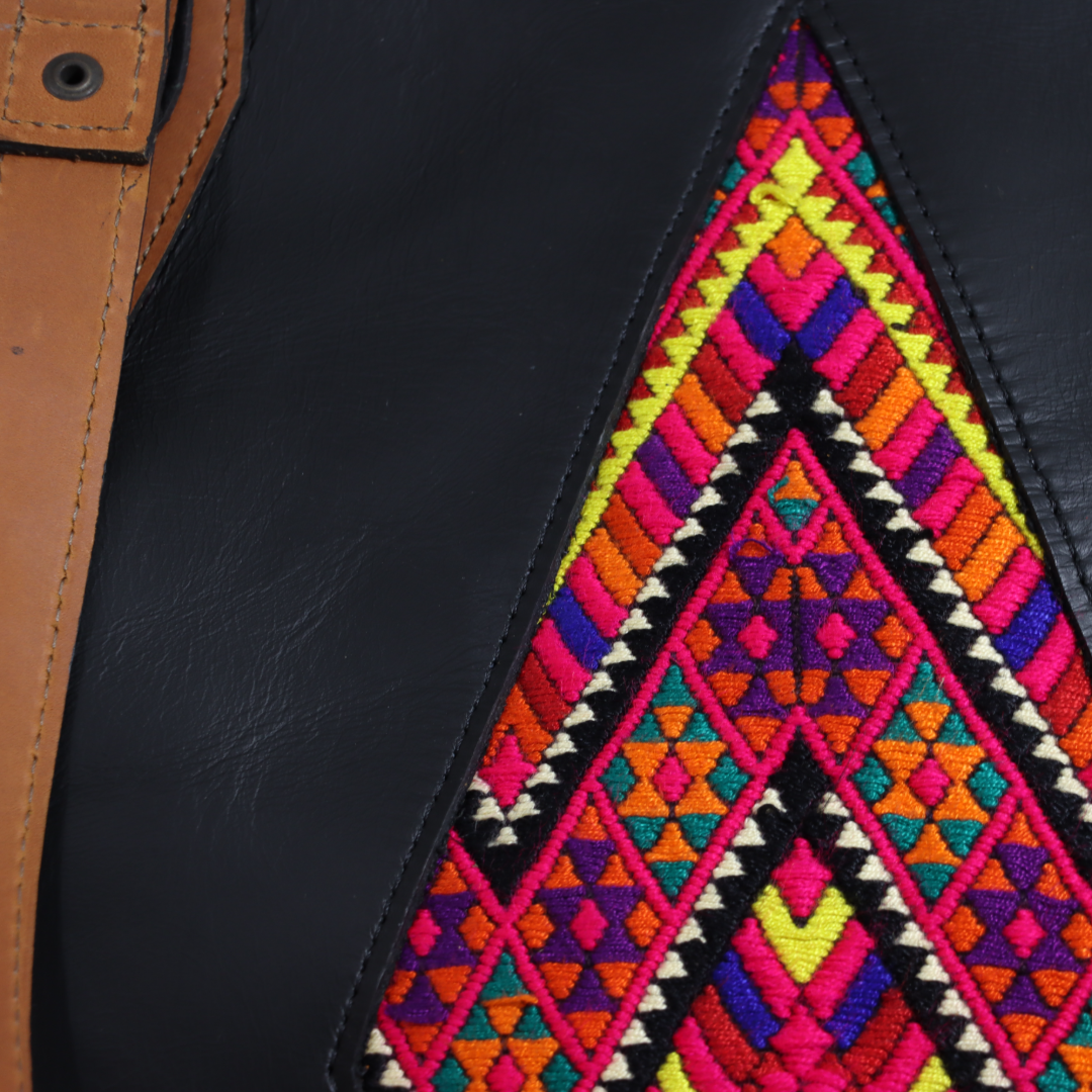 The Alzatate tote bag represents the perfect fusion of contemporary elegance and rich Guatemalan textile tradition. This spacious handcrafted tote is made from high-quality genuine black leather and features a stunning diamond-shaped front panel with authentic hand-woven Mayan textile. The vibrant multicolor geometric patterns in pink, yellow, purple, orange, and turquoise are meticulously crafted by local artisans using ancestral backstrap loom techniques, creating a functional work of art that celebrates Mayan cultural heritage.