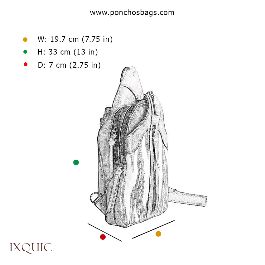 Every Ixquic sling bag is truly unique — genuine leather develops natural variations in tone and texture that are part of its authenticity, and Mayan textile patterns vary slightly according to the artisan’s work, ensuring no two sling bags are exactly alike. With daily use, the leather will develop a unique personalized patina reflecting your urban adventures and travels, making your sling bag truly yours.